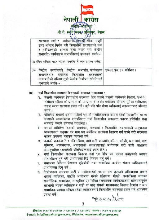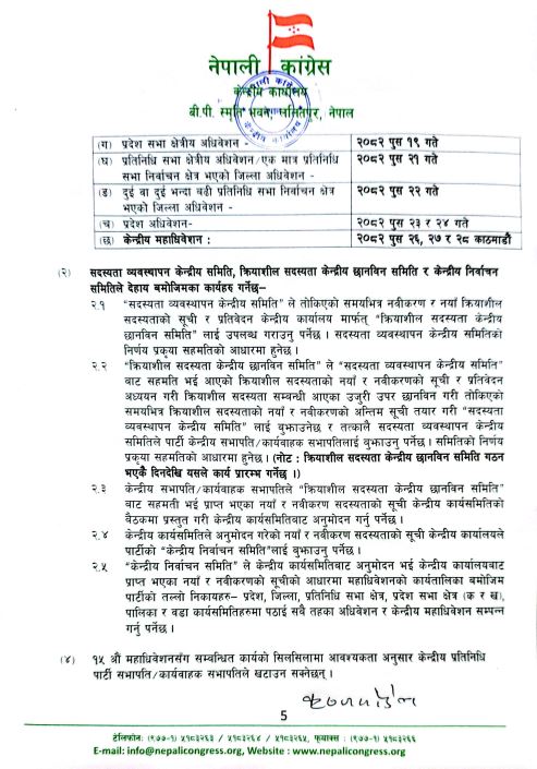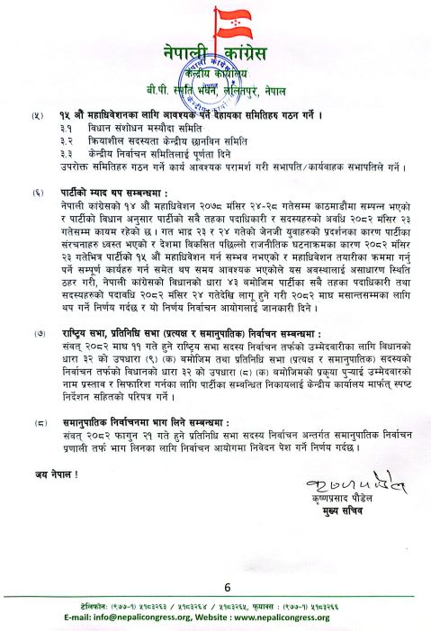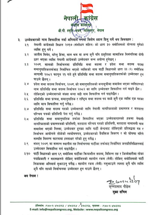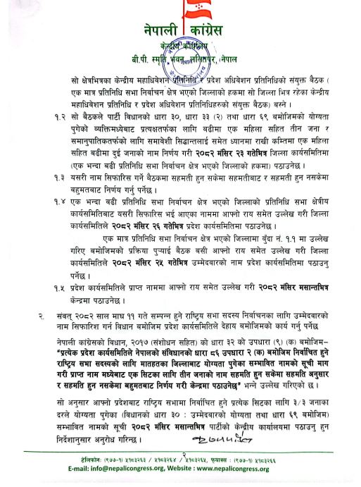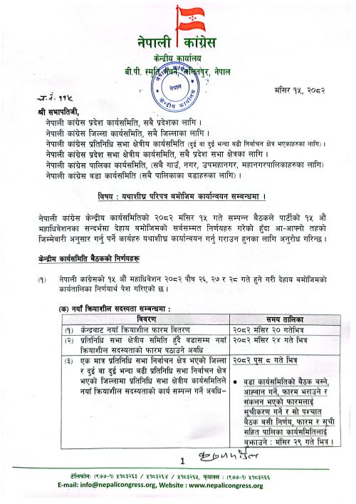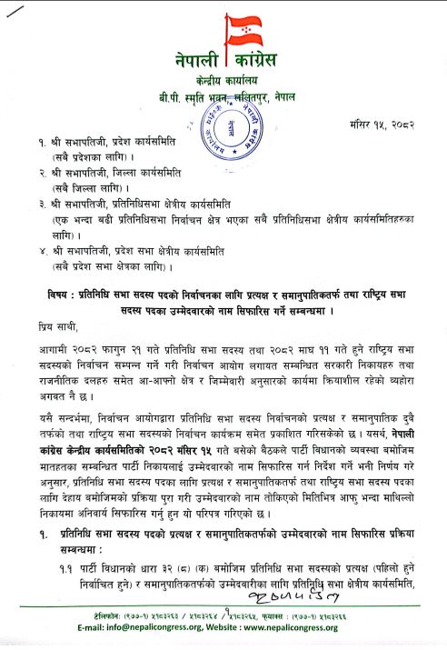 नेपाली कांग्रेसको १५औं महाधिवेशन तथा संघीय निर्वाचन फागुन २१ गतेको निर्वाचनलाई लिएर कांग्रेसका नेता तथा कार्यकर्ताबीच आम निर्वाचिनको विषयमा छलफल कार्यक्रमलाई अगाडि बढाएका छन् । जस अनुसार कांग्रेसको केन्द्रीय कार्यालयको परिपत्र अनुसार यही २३ गतेभित्र संघीय निर्वाचन र माघमा हुने राष्ट्रिय सभा निर्वाचनका लागि छुट्टाछुट्टै नाम सिफारिस समेत गर्नु भनी गरेको परिपत्र पहिले भन्दा फरक देखिन्छ ।