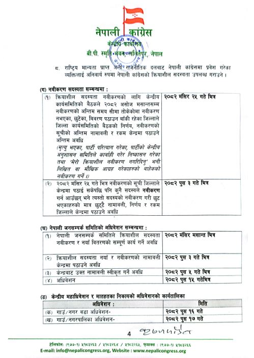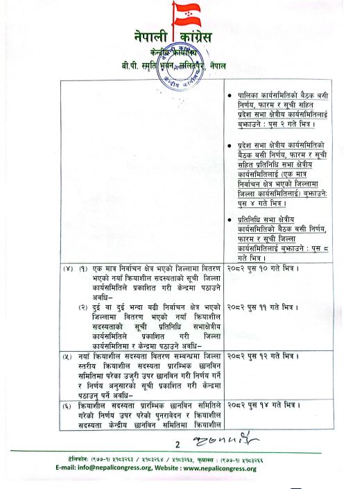 केन्द्रमा संस्थापन पक्ष र संस्थापन इतर पक्षबीच निकै लामो रस्साकस्सीपछि नियमित महाधिवेशनको कार्यतालिका सार्वजनिक भएसँगै कांग्रेसभित्र महाधिवेशनको चटारो सुरु भएको छ । केन्द्रले सार्वजनिक गरेको कार्यतालिका समयसीमाको ख्याल नगरी सुगम क्षेत्रको लागि मात्र हुने गरी गरेको भन्दै हिमाली तथा कर्णालीका दुर्गम जिल्लाबाट कार्यतालिकाका बारेमा असन्तुष्टि व्यक्त गरिरहेको भएता पनि संगठन विस्तारको काममा भने सबै क्षेत्रको कांग्रेस नेताहरु लागिपरेको देखिन्छ ।