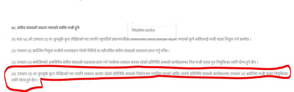 नेपालको संविधानको धारा ७८ अनुसार प्रतिनिधिसभाको निर्वाचनमा पराजित भएको ब्यक्ति सो प्रतिनिधिसभाको कार्यकाल भरी सरकारमा सहभागि हुन सक्दैन।