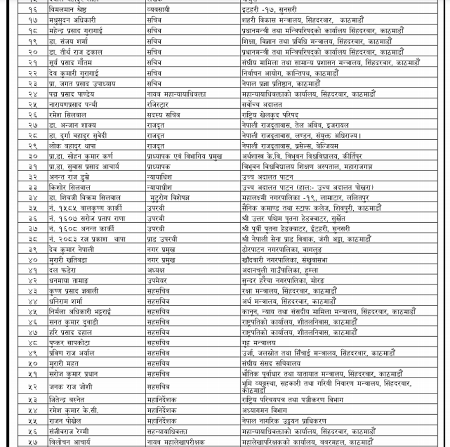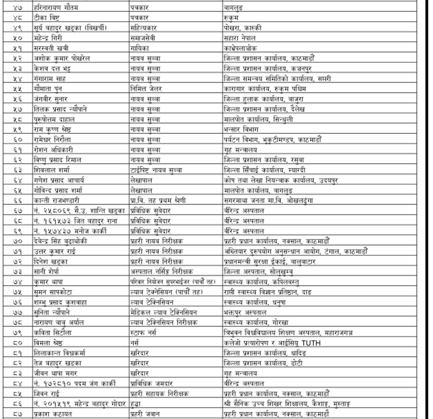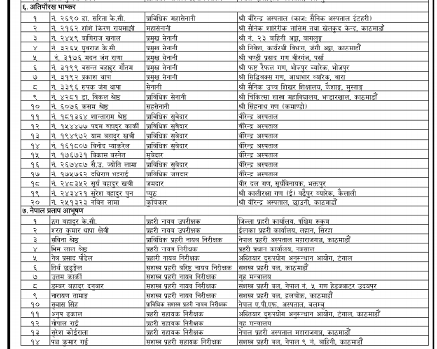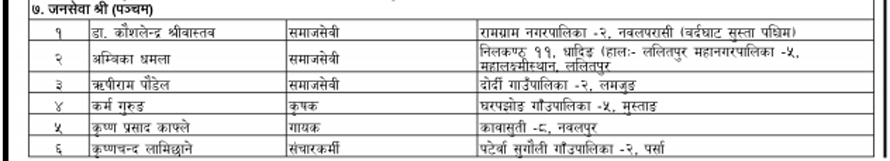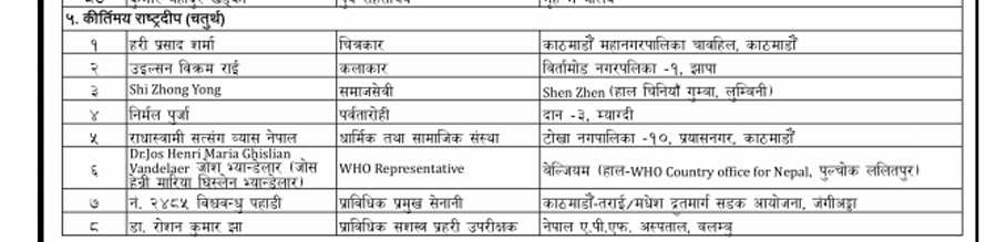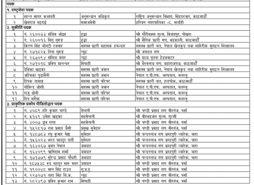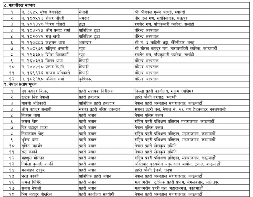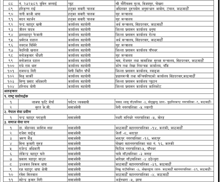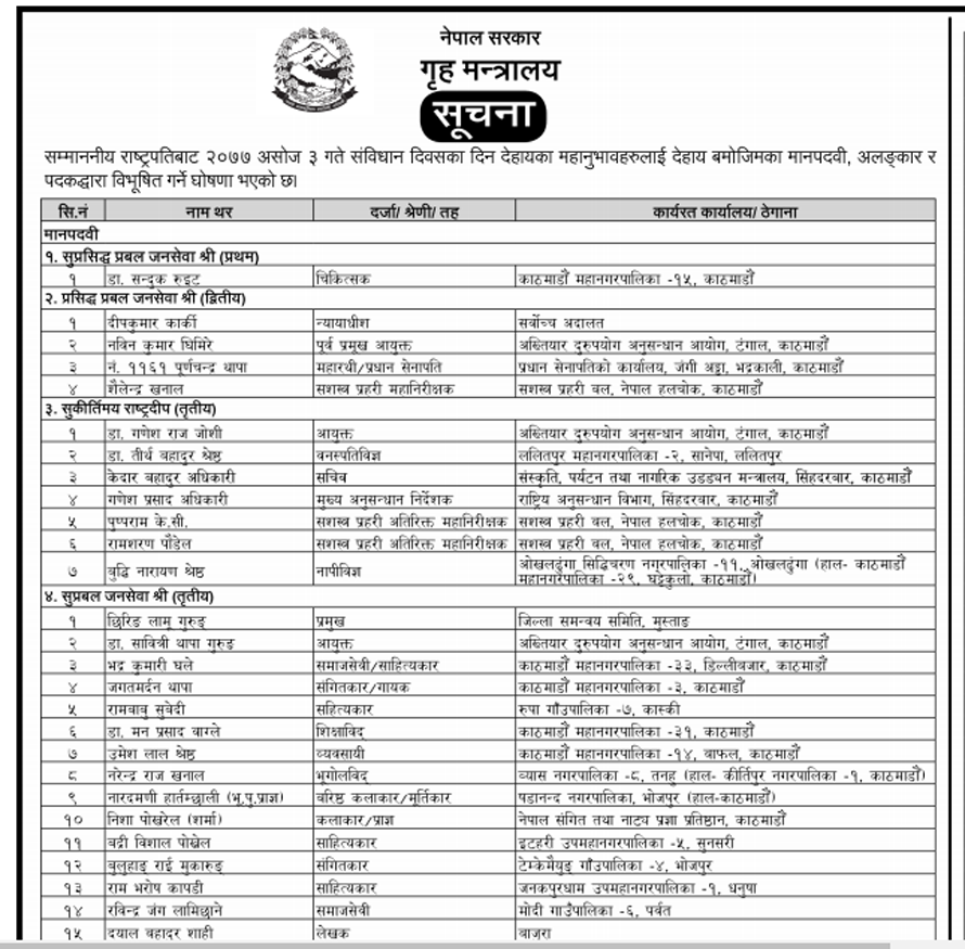 यसबाहेक सरकारले सार्वजनिक गरेको सूचीअनुसार ४५३ जनालाई मानपदवी ११४ जनालाई अलंकार र २७ जनालाई पदकबाट सम्मान गरिने छ । विभूषण, अलंकार र पदक आगामी संविधान दिवसको दिन राष्ट्रपति विद्यादेवी भण्डारीबाट वितरण हुने छ ।