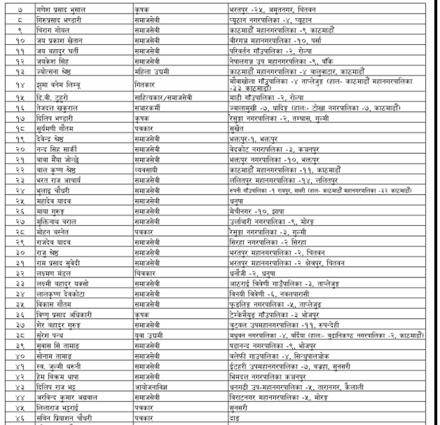 यस वर्षको संविधान दिवसको अवसरमा सम्मानित हुनेहरुको सूचीमा १४ जना पत्रकार र दुई जना सन्चारकर्मीसमेत छन् ।