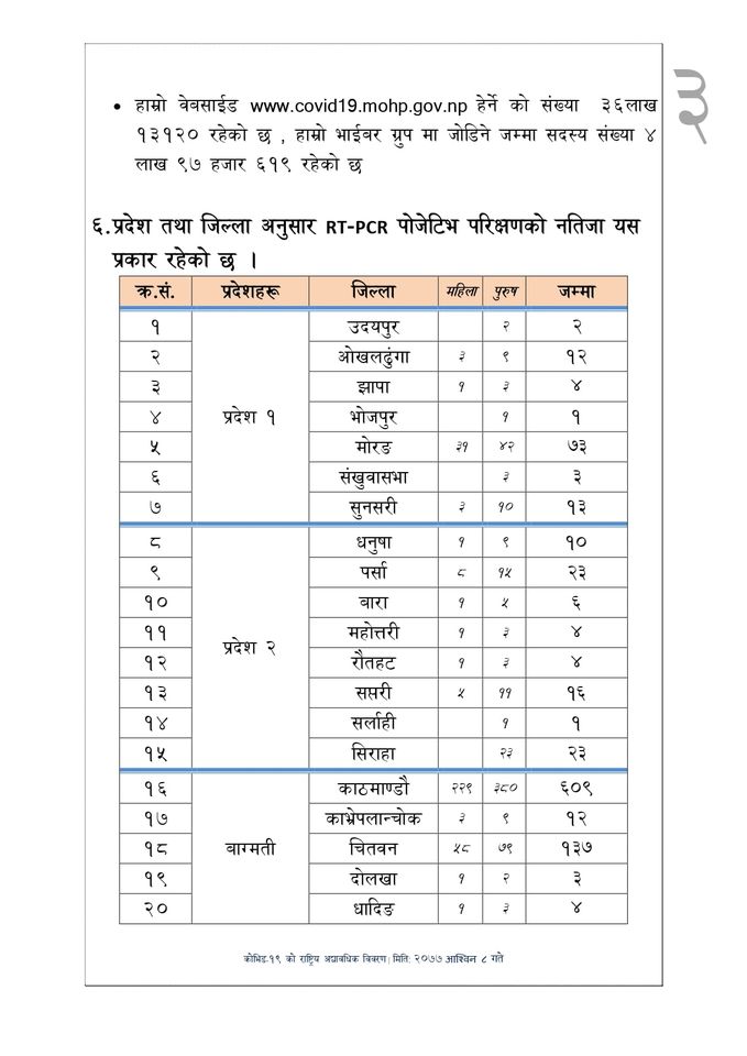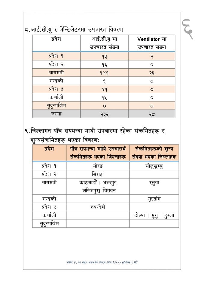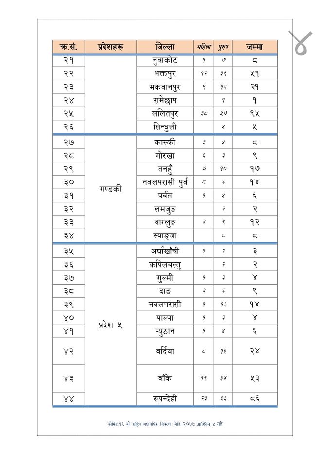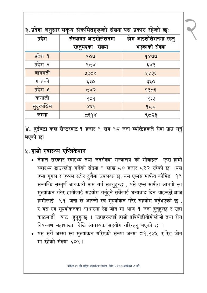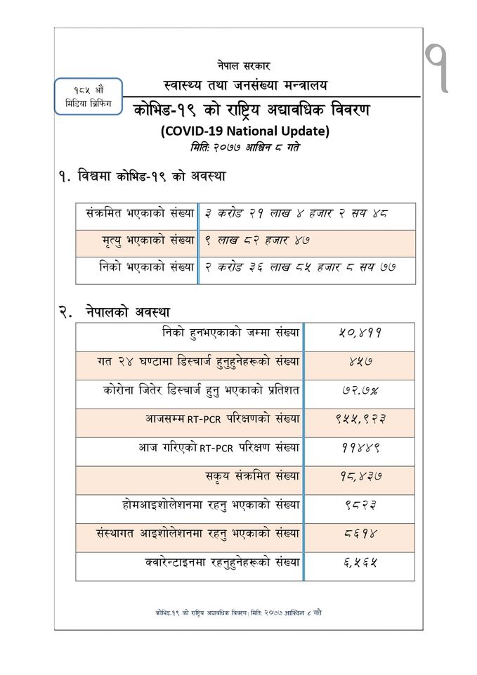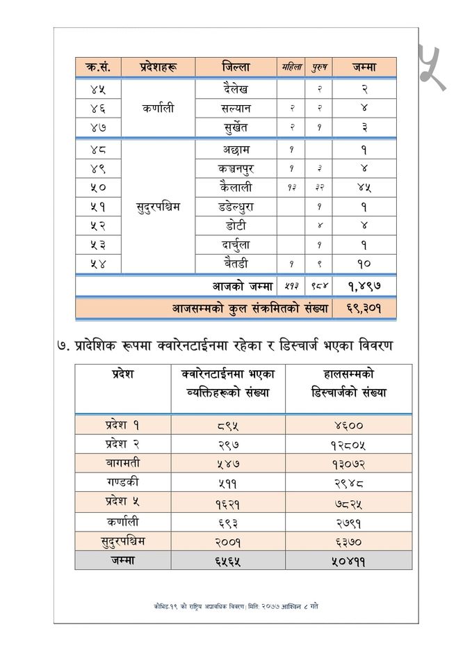 हालसम्म संक्रमित हुनेको संख्या ६९ हजार ३०१ पुगेको छ। यस अवधिमा कोरोनाबाट ४५७ जना निको भएका छन्। हालसम्म ५० हजार ४११ जना कोरोनाबाट निको भएको गौतमले बताए । मन्त्रालयका अनुसार अहिले देशभर १८ हजार ४३७ जना सक्रिय संक्रमित रहेका छन्।