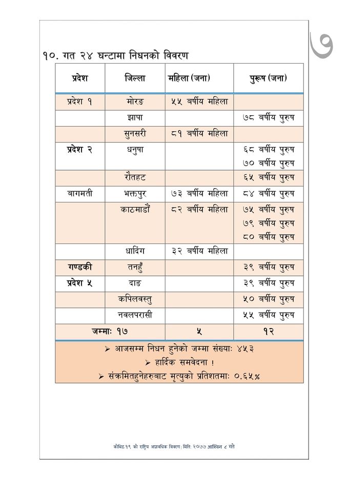 मृतक थप १७ जनामा कोरोना पुष्टि भएको छ। हालसम्म मृतक ४५३ जनामा कोरोना पुष्टि भएको छ। यस दिन कुल ११ हजार ४४९ जनाको पिसिआर परीक्षण भएको मन्त्रालयले जनाएको छ ।