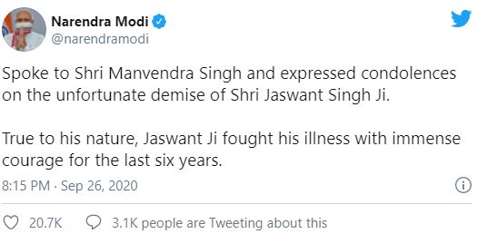 पूर्वमन्त्री तथा बीजेपीका वरिष्ठ नेता सिंहको निधनमा भारतीय प्रधानमन्त्री नरेन्द्र मोदीले समेत दुख व्यक्त गरेका छन् ।