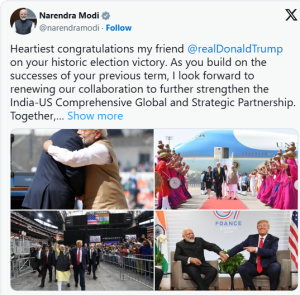 उनले ‘भारत अमेरिकी विस्तृत वैश्विक तथा रणनीतिक साझेदार’मा जोड दिँदै बधाइ दिएका छन्। चुनावी अभियानकै क्रममा ट्रम्पले मोदीको तारिफ गरेका थिए। अघिल्लो कार्यकालमा ट्रम्प मोदीको गृहनगर पनि पुगेका थिए।